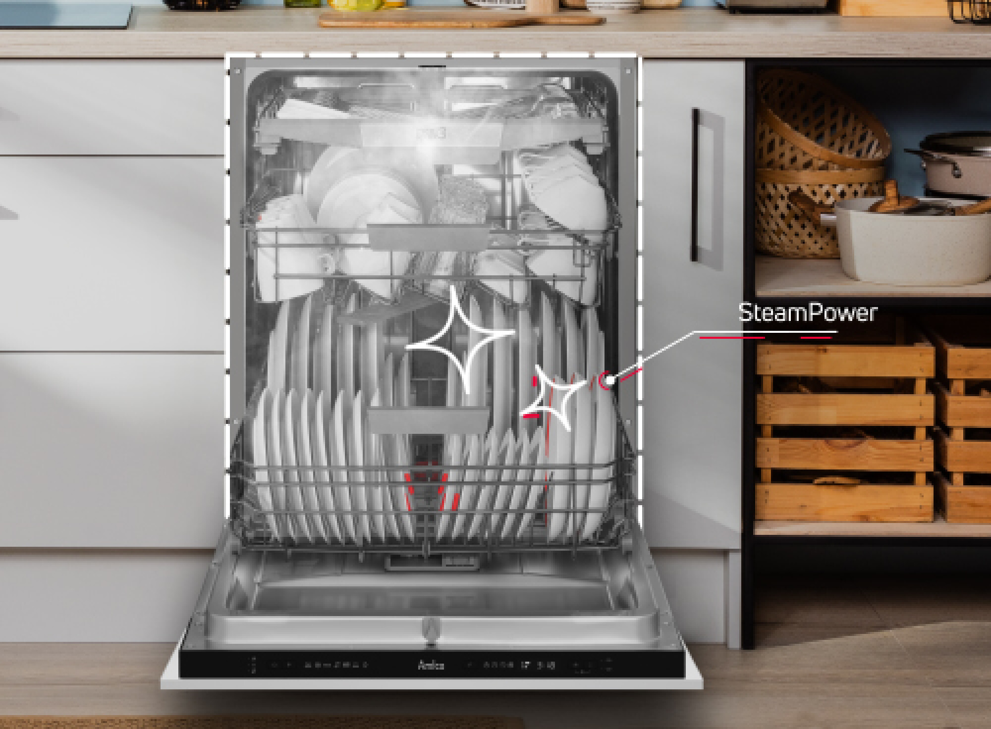 | Second Level Spray Arm Type Amica design spray arm | SteamPower Yes | 3 level of spraying Nozzle | Turbidity sensor Yes | Type of dispenser Small sliding dispenser | Water heater technology Yes |