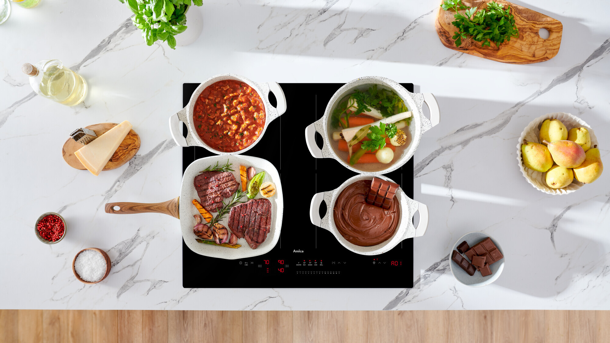 | Overflow detection Yes | Overheat detection Yes | Pause function Yes | Power Choice Pro Yes | Power Management Yes | Precision grilling programme (200°C) Yes | Precision melting programme (40°C) Yes | Precision slow cooking programme (90°C) Yes | Precision stewing programme (70°C) Yes | Residual heat indicator Yes | Front right heating zone dimension (cm) 22x19 | Right front zone energy consumption FR 174.9 Wh/kg | Front right heating zone power rating (kW) 2.2/3 | Right front zone type FR Induction | Rear right heating zone dimension (cm) 22x19 | Right rear zone energy consumption RR 174.9 Wh/kg | Rear right heating zone power rating (kW) 2.2/3 | Right rear zone type RR Induction | Slider control Yes | SlimHob PRO Yes | Small object detection Yes | Temperature limiter Yes | Auto switch off Yes | Timer Yes | Hob energy consumption 174.9 Wh/kg | 2x AutoBridge Yes | Control type Slider |